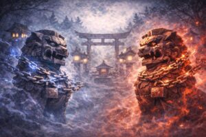 🗿 左右様(右・左)は“対”の象徴同じ対でも同じじゃない——ズレ=緊張が力になり、共同体のルールとして個人を縛る匂いが立ち上がる