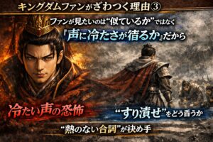 - キングダムファンがざわつく理由③ ファンが見たいのは“似ているか”ではなく、“声に冷たさが宿るか”だから