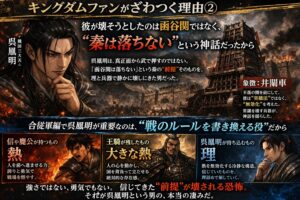 呉鳳明というキャラが面白いのは、史実の再現ではなく、『キングダム』が自分たちの戦争観を託した存在だからです。武だけでは勝てない。勇気だけでは国を守れない。熱がどれほど尊くても、それだけでは崩される。